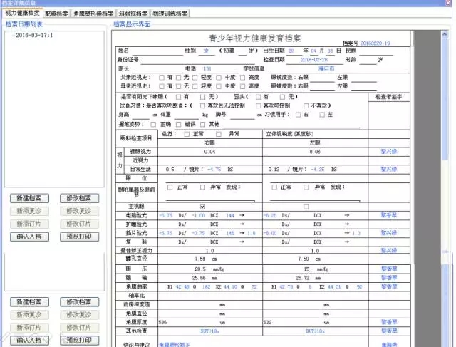 《視力發(fā)育檔案》是一份像學(xué)籍一樣的視力健康檔案,包括裸眼視力、眼壓、眼軸、電腦驗(yàn)光、綜合驗(yàn)光、散瞳、矯正視力、角膜曲率等10多項(xiàng)與視力發(fā)展相關(guān)的項(xiàng)目。通過數(shù)據(jù)的收集,醫(yī)生可以及時(shí)掌握孩子每次檢查結(jié)果,以預(yù)測和預(yù)防孩子眼睛發(fā)育成長過程中的實(shí)際情況,對(duì)視覺系統(tǒng)出現(xiàn)的問題真正做到預(yù)防、預(yù)測、干預(yù)、控制,從而起到保護(hù)孩子視力健康發(fā)展的作用。